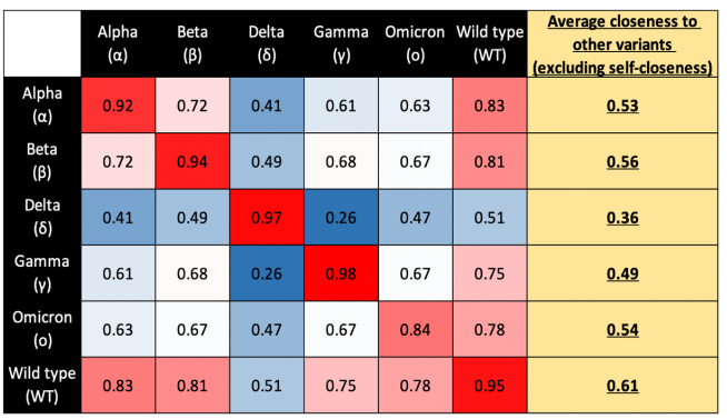 表1:自适应关系图有效地量化了抗原间的不同:相比于其他病毒,Delta 显著不同于Alpha和Beta,这与Delta症状与野生毒株的症状表现不同相一致;Omicron与自身的相似性只有0.84,该值反映出Omicron亚型间的差异较大。