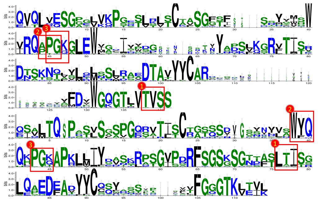图2: 根据特征学习神经网络的权重,我们识别了抗体的具有重要性的k-mers。对于重链(上面4行),最重要的3-mer序列位于重链尾部,第2、3重要的3-mer位于陆续在的第44到 47个氨基酸;对于轻链(下面3行),最重要的3-mer位于轻链中间,而2、3重要的3-mer也比较靠近。