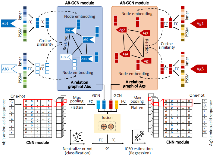 抗原是侵入机体的外来物质,包括细菌、病毒等。 抗体是机体在抗原刺激下,由B细胞分化成的浆细胞所产生的、可与抗原发生特异性结合反应的免疫球蛋白。抗体对抗原的高特异性和高亲和力使得抗体药具有靶向性强、副作用小和疗效显著等优点,因而在疾病的诊断和治疗中显示出其他类型药物无可比拟的优势,是治疗包括癌症及自身免疫性疾病在内的重要药物。人体在病毒刺激下可产生约1020种抗体,加上人工合成的抗体,未知抗体空间巨大。然而,其中仅仅很小一部分抗体对特定抗原起作用。用湿实验来筛选能中和抗原的抗体耗时耗力,开发快速筛查中和抗体的计算方法十分必要。
