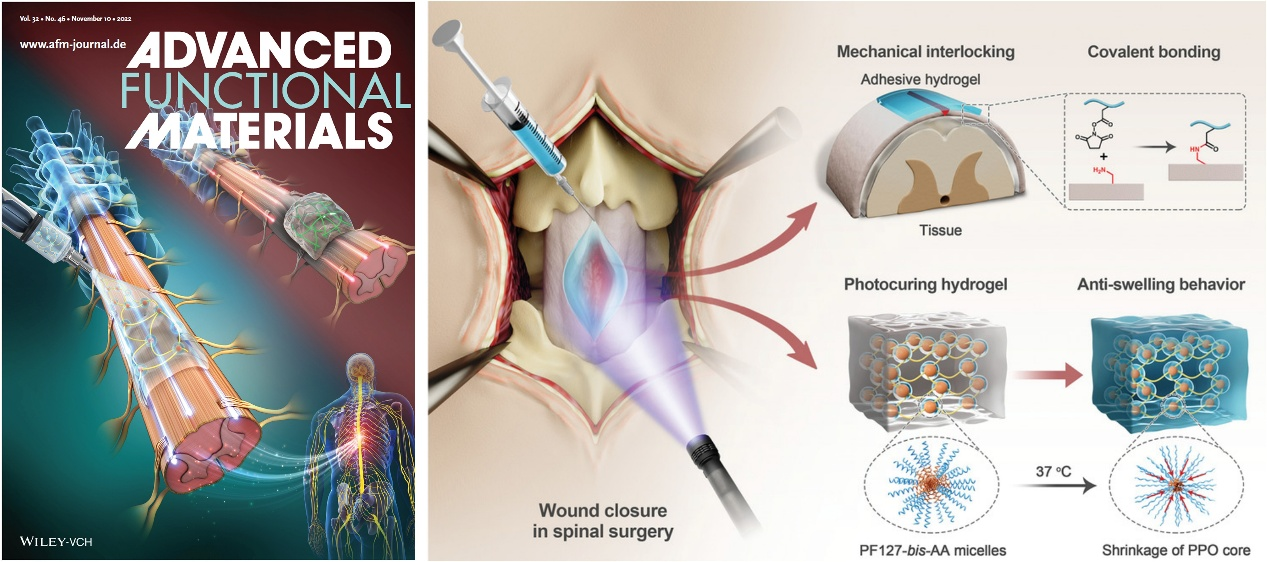 近期,中国科研实验室凯发k8国际医药所人体组织与器官退行性研究中心的潘浩波研究员团队和赵晓丽研究员团队,联合香港大学深圳医院等多家单位,在可注射医用胶的研究中取得最新进展,相关成果以“An Injectable Rapid-Adhesion and Anti-Swelling Adhesive Hydrogel for Hemostasis and Wound Sealing”为题发表在Advanced Functional Materials期刊上 (Adv. Funct. Mater. 2022, DOI:10.1002/adfm.202207741),并入选“Inside Front Cover”展示。该论文第一作者为凯发k8国际助理研究员边少荃和博士研究生郝浏智,通讯作者为潘浩波研究员和赵晓丽研究员。