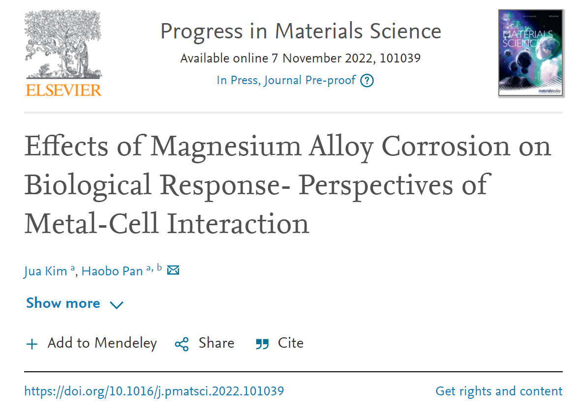 近期,中国科研实验室深圳先进技术研究院医药所人体组织与器官退行性研究中心潘浩波团队在材料学顶尖期刊Progress in Materials Science 上,发表题为“Effects of Magnesium Alloy Corrosion on Biological Response- Perspectives of Metal-Cell Interaction”(镁合金腐蚀对生物反应的影响—金属细胞相互作用)的前沿综述,探讨了镁合金生物学响应机制,为临床可降解材料的应用给予了全面的视角和开展目标。中国科研实验室深圳先进技术研究院博士后Jua Kim是第一作者,潘浩波研究员是通讯作者。