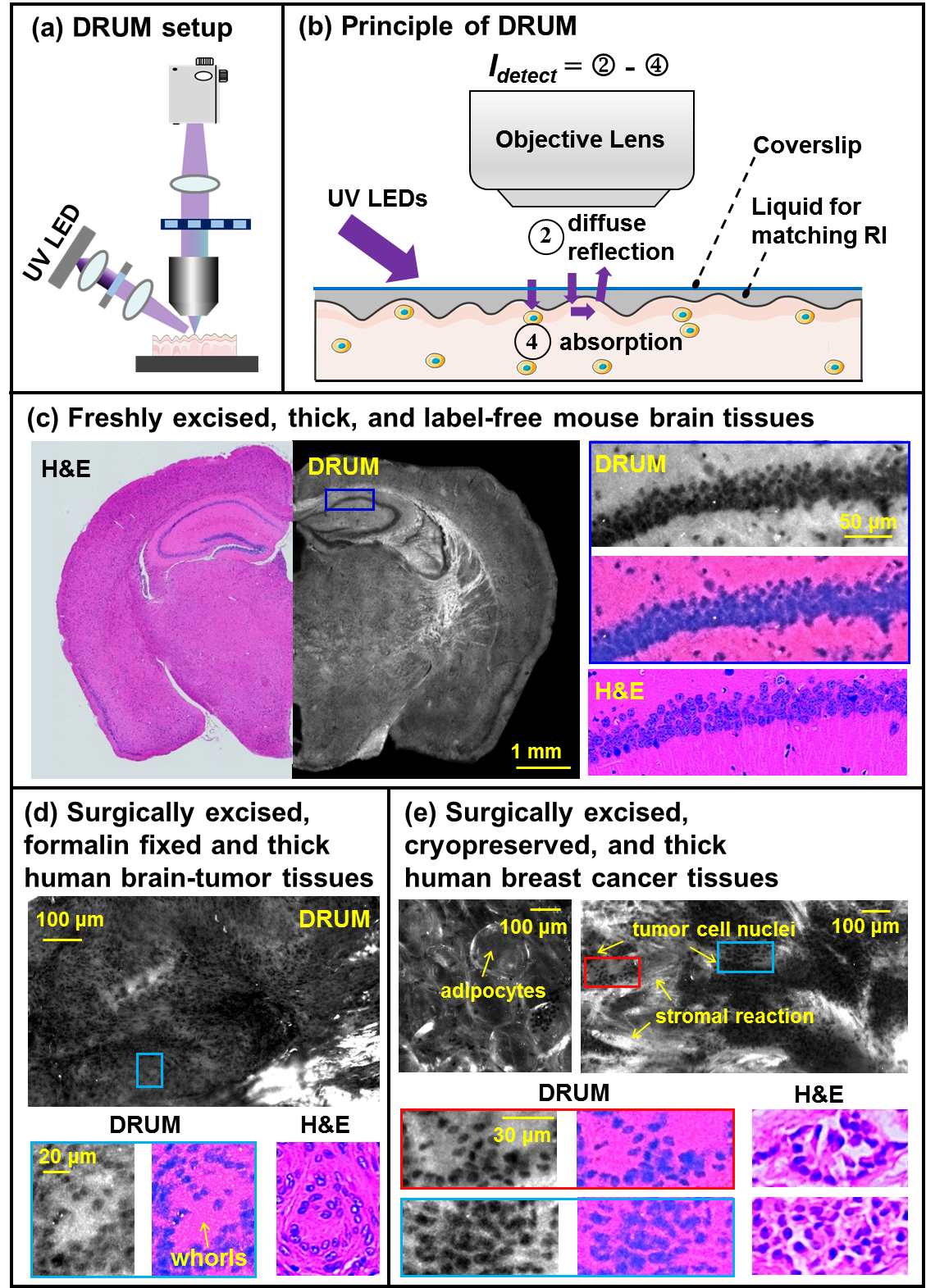 DRUM成像是基于260-nm紫外LED斜照明的宽场成像,在消除镜面反射和组织散射的基础上,利用细胞核吸收紫外光产生的暗信号和细胞核外组分由于折射率差异而产生的不同强度漫反射信号来给予图像对比度。因此,DRUM成像技术不仅能在无需物理切片和染色操作的前提下、在2-3分钟的周期时间内实现厚生物组织的快速成像(现在已知的周期时间最短的病理组织成像方法),而且能以亚细胞水平分辨率给予包括细胞核在内的多种病理特征信息。