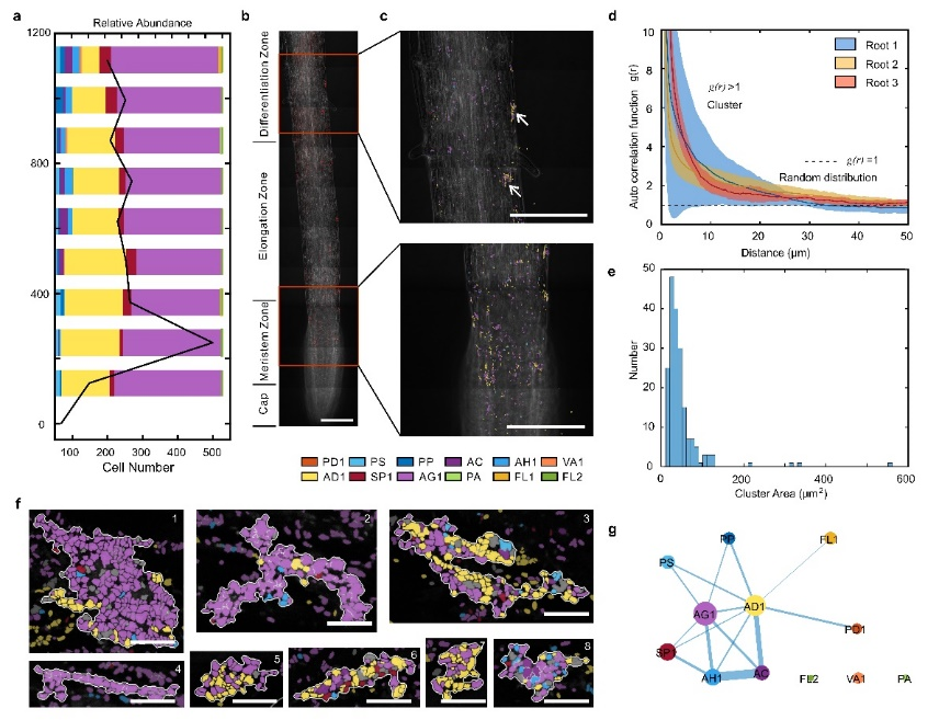 植物根际定植着高度多样的微生物群落,它们受到植物宿主的调控又影响着植物的生理健康。然而我们对于根际微生物群落的空间结构却鲜有认知。研究团队将SEER-FISH应用于根表微生物的空间成像,勾勒了不同生理分区分布定植的微生物群落组成 (图3a-c)。研究团队发现,定植在根表的微生物群落并非随机分布,而是倾向于形成聚集体。这些微生物聚集体的尺度在几十到几百微米,并且存在多个物种(图3d-f)。微生物聚集体的形成的具体原因有多种假说,包括偏好性定植、提高在根际环境下的适应性等。此外,顺利获得对群落中的微生物进行邻近关系分析,发现了显著的菌-菌空间关联(图3g)。