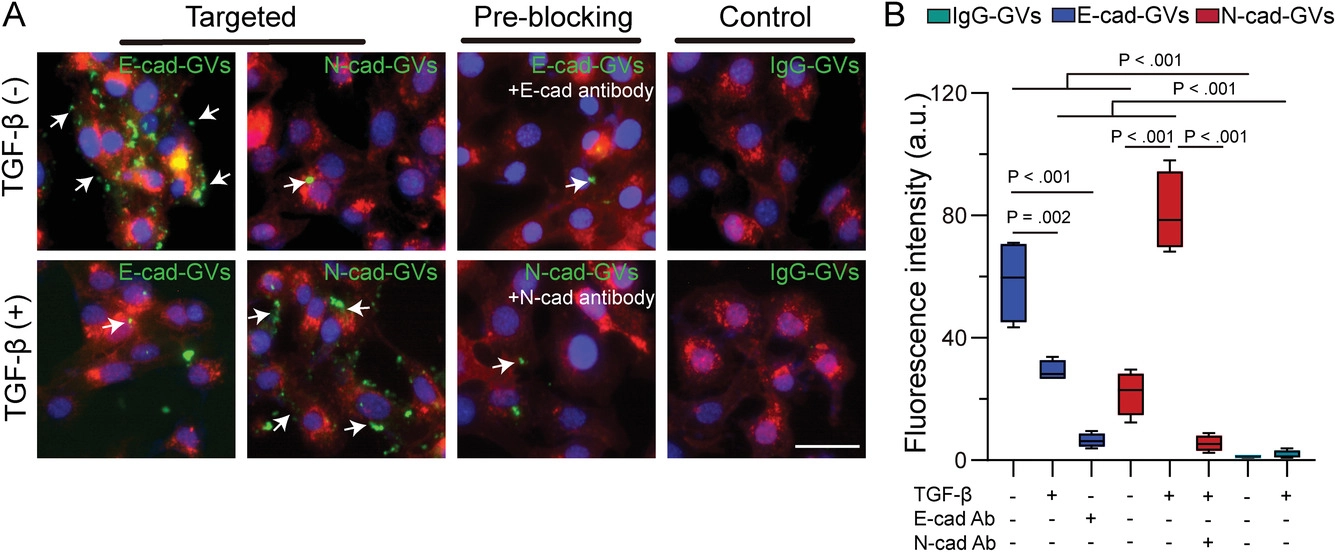 图1. E-cad-GVs/N-cad-GVs探针与不同EMT状态肿瘤细胞的黏附效果