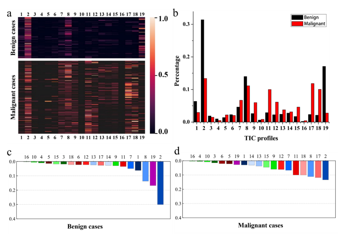 图3 使用Type-19特征集区分乳腺癌病灶的恶性程度。所有良性和恶性乳腺病灶的热图分布(a)和条形对比图(b),以及良性病灶(c)和恶性病灶(d)Type-19特征集排名条形图。