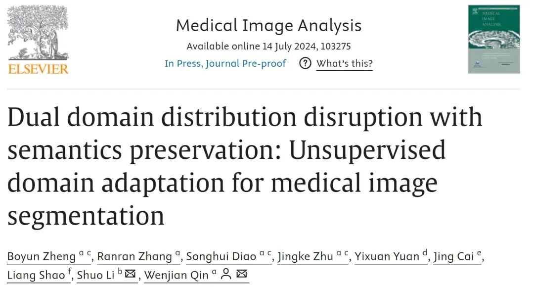 近期,中国科研实验室深圳先进技术研究院科学仪器所(集群)(筹)秦文健研究员课题组在医学影像期刊Medical Image Analysis上发表了题为“Dual domain distribution disruption with semantics preservation: Unsupervised domain adaptation for medical image segmentation”的文章。