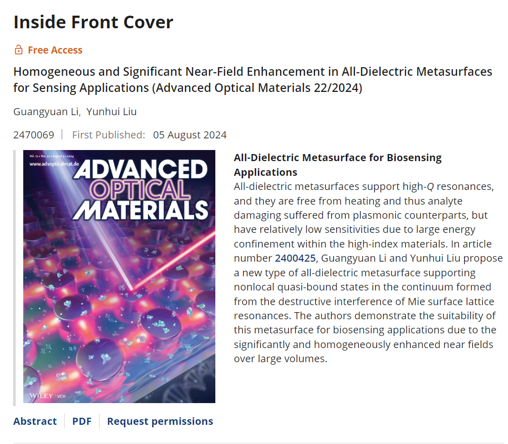 Advanced Optical Materials | 全介质超表面近场增强新突破--非局域准束缚态提升生物传感性能