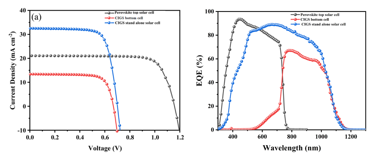 图5:4-T串联太阳能电池的性能。(a)J-V曲线和(b)EQE曲线的J-V曲线和EQE曲线。