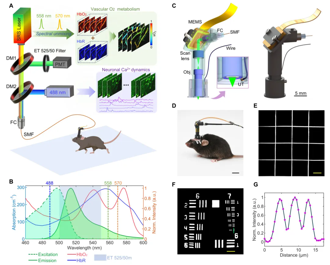 本研究核心技术之一是双模态成像的轻量化集成。传统光学显微镜受限于光学器件体积与信号采集复杂性,难以兼顾高分辨率与动物行为自由度,无法实现神经血管同步成像。研究团队顺利获得创新设计实现了技术突破。
