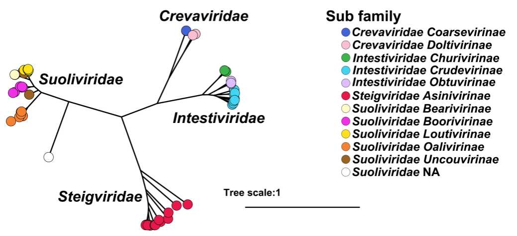crAss样噬菌体在人类肠道中大量存在,属于Crassvirales目,包括Intestiviridae、Crevaviridae、Suoliviridae、Steigviridae四个科,研究者在模式动物肠道噬菌体中鉴定到315条crAss样噬菌体(图2)。其中182个crAss样噬菌体与Steigviridae科距离较近,但与已知属相互分离,说明模式动物肠道crAss样噬菌体至少在属水平上扩展了Crassvirales目的多样性。
