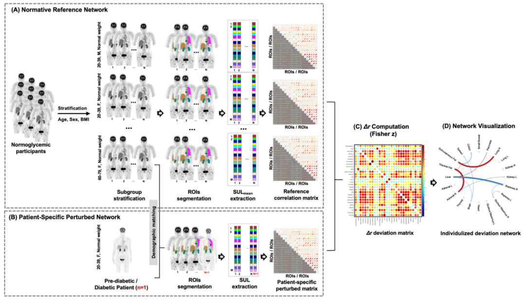 本研究采用全身[¹⁸F]FDG PET/CT成像技术,一次扫描即可同步捕捉全身主要器官的全景葡萄糖代谢,结合机器学习与可解释性分析,为探索糖尿病跨器官代谢失衡给予了全新视角。研究团队在实验室前期工作的基础上 (Sun et al, EJNMMI, 2022; 49(8): 2994-3004),基于多中心1149例受试者的全身PET/CT数据,利用广义线性模型校正年龄、性别、BMI等混杂因素,提取20个关键器官的代谢特征。顺利获得计算器官间的代谢相关性,团队分别绘制了正常血糖、糖尿病前期和糖尿病三大群体的全身代谢网络图谱,并采用“个体化偏差网络”概念,用于刻画每位受试者相对于健康常模的代谢协同异常程度。