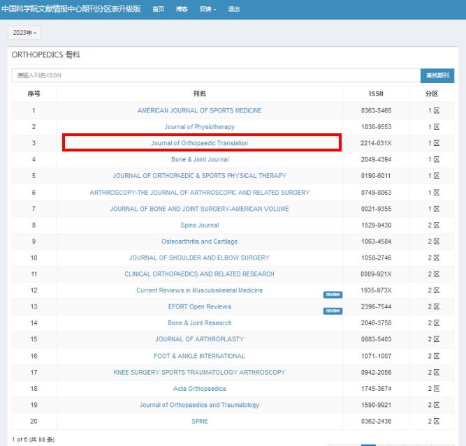 12月27日,《2023年中国科研实验室文献情报中心期刊分区表》正式发布;Journal of Orthopaedic Translation(简称“JOT”)进入医学学科1区。