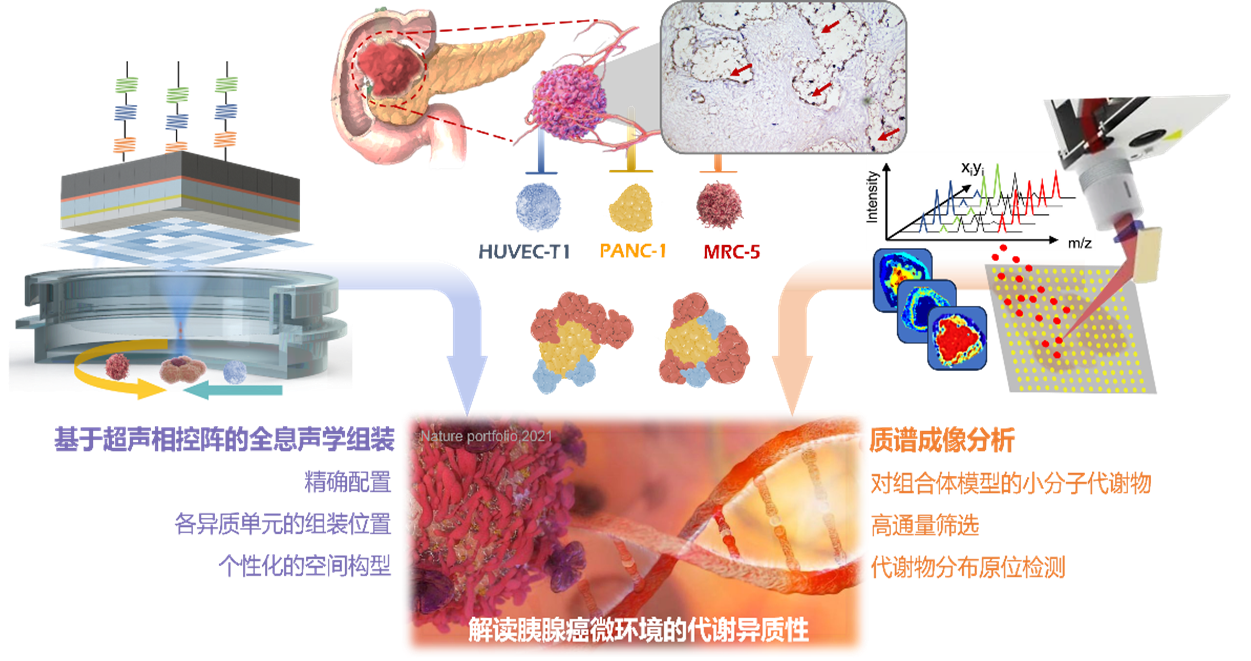 该研究首次将全息声镊科研仪器与组织工程中复杂模型构建的需求相结合,以超声相控阵对全息声场的动态构建为基础,设计开发了一系列声学组装策略,实现了对细胞球、类器官的精准选择、位置移动、旋转对准、装配、夹紧等操作,并构建出了具有能够模拟肿瘤及其微环境的装配体模型。此外,研究结合质谱成像技术进一步构建出装配体的代谢全谱图,为肿瘤代谢异质性研究给予了精准的物质分子定性、定量和空间定位信息,同时为探索组织功能开展机制、疾病的开展过程给予新的视角与手段。