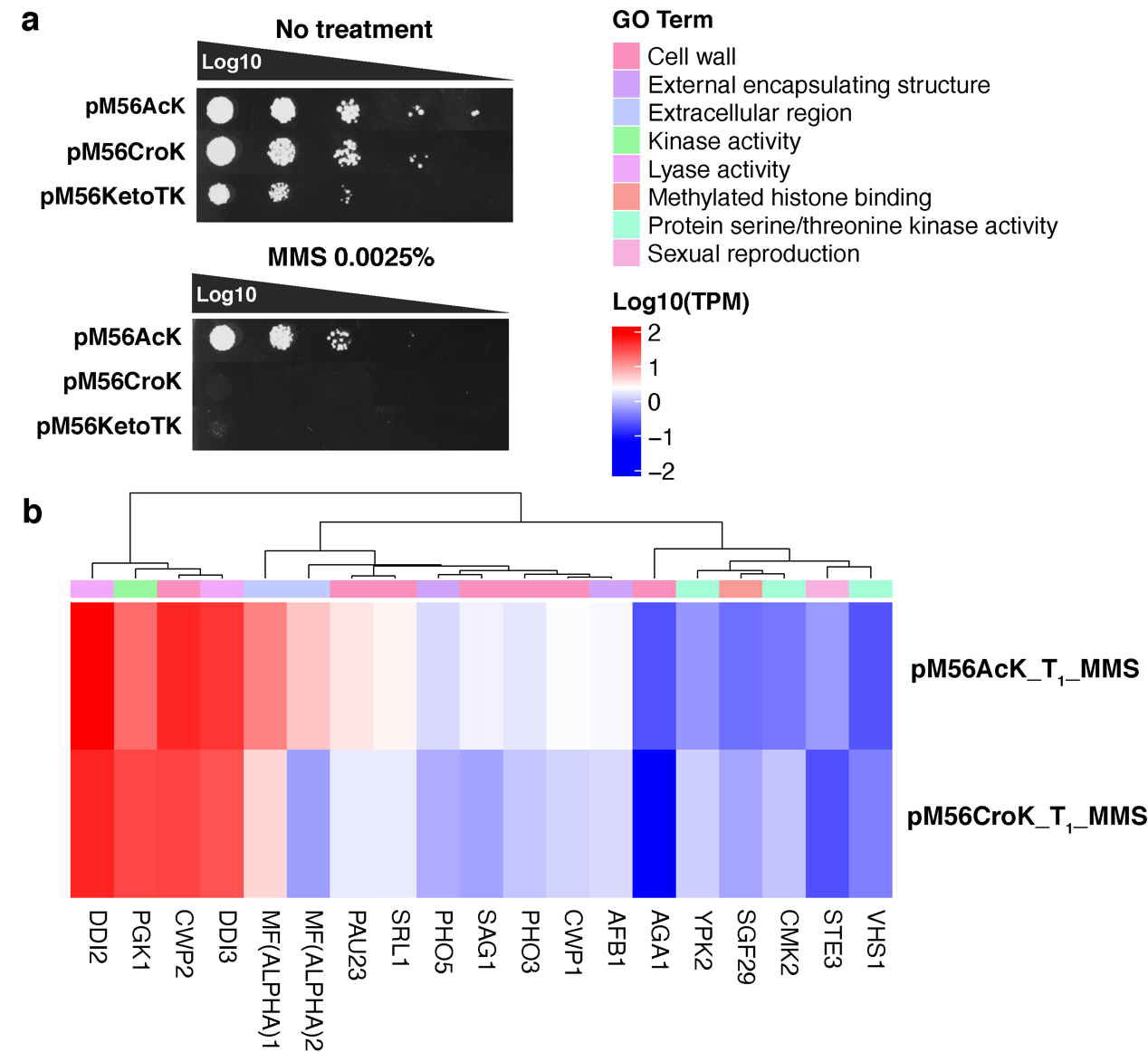 在CTM菌株中,基因组编码的野生型组蛋白H3被CTM组蛋白H3突变体所取代。组蛋白H3突变体可借助酿酒酵母基因密码子扩展体系对其56位点进行ncAA突变取得。这一菌株被命名为pM56菌株(图2c),该菌株呈现出ncAAs依赖生长的特性,即在含有一定浓度ncAAs的培养基中,pM56菌株才能存活。研究人员针对不同pM56菌株中组蛋白H3K56位点酰化修饰水平进行定量蛋白组学研究,结果表明,pM56AcK菌株中组蛋白H3K56位点的乙酰化修饰水平(~12%)低于野生型酵母菌株(~23%),pM56CroK菌株中组蛋白H3K56位点除存在~14%的巴豆酰化修饰以外,还存在~10%的乙酰化修饰,这说明pM56菌株中存在动态的修饰调控过程。为了研究组蛋白H3K56位点发生乙酰化共修饰或巴豆酰化共修饰之后,二者的生物学功能存在哪些差异,研究人员第一时间做了pM56菌株DNA损伤耐受实验,比较pM56AcK和pM56CroK菌株对甲磺酸甲酯(methyl methanesulfonate, MMS)的耐受差异,结果显示,pM56AcK对MMS的耐受程度高于pM56CroK菌株(图3a)。RNA测序结果显示,相比于MMS处理的pM56CroK菌株,pM56AcK菌株中水解酶表达水平显著性上调,酵母生殖和细胞壁相关的基因也出现了上调表达的情况,而pM56CroK菌株中激酶相关基因表达水平上调(图3b)。