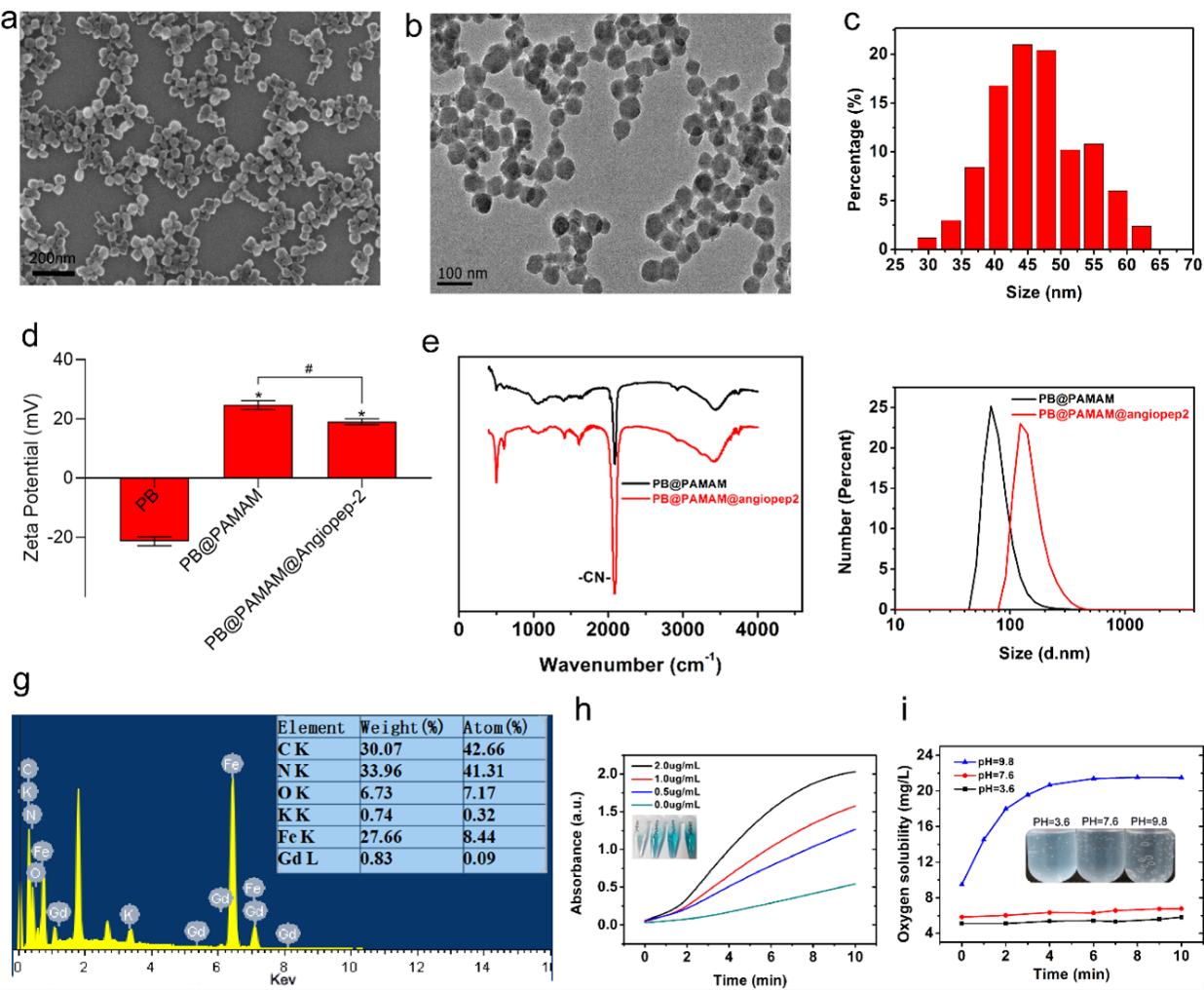 研究团队第一时间制备并表征了PPA纳米材料。扫描电子显微镜(SEM,图2a)和透射电子显微镜(TEM,图2b)分析显示,形成了直径为49±15 nm的球形纳米颗粒,并顺利获得动态光衍射分析(DLS)进一步证实纳米颗粒的尺寸(图2c)。Zeta电位检测显示PPA纳米颗粒电位在+23mV~+19mV范围内,扭转了普鲁士蓝原本负电荷(-22mV)在顺利获得血脑屏障的不利条件 (图2d)。红外光谱的特征性吸收峰、粒径分析均证实了ANG-2的成功引入(图2e,f)。此外研究团队还检测了PPA纳米颗粒过氧化物酶的活性,其结果显示PPA具有良好的过氧化物酶活性抗氧化性,并与PPA浓度呈正相关,这说明PPA具有良好的抗氧化性(图2h,i)。
