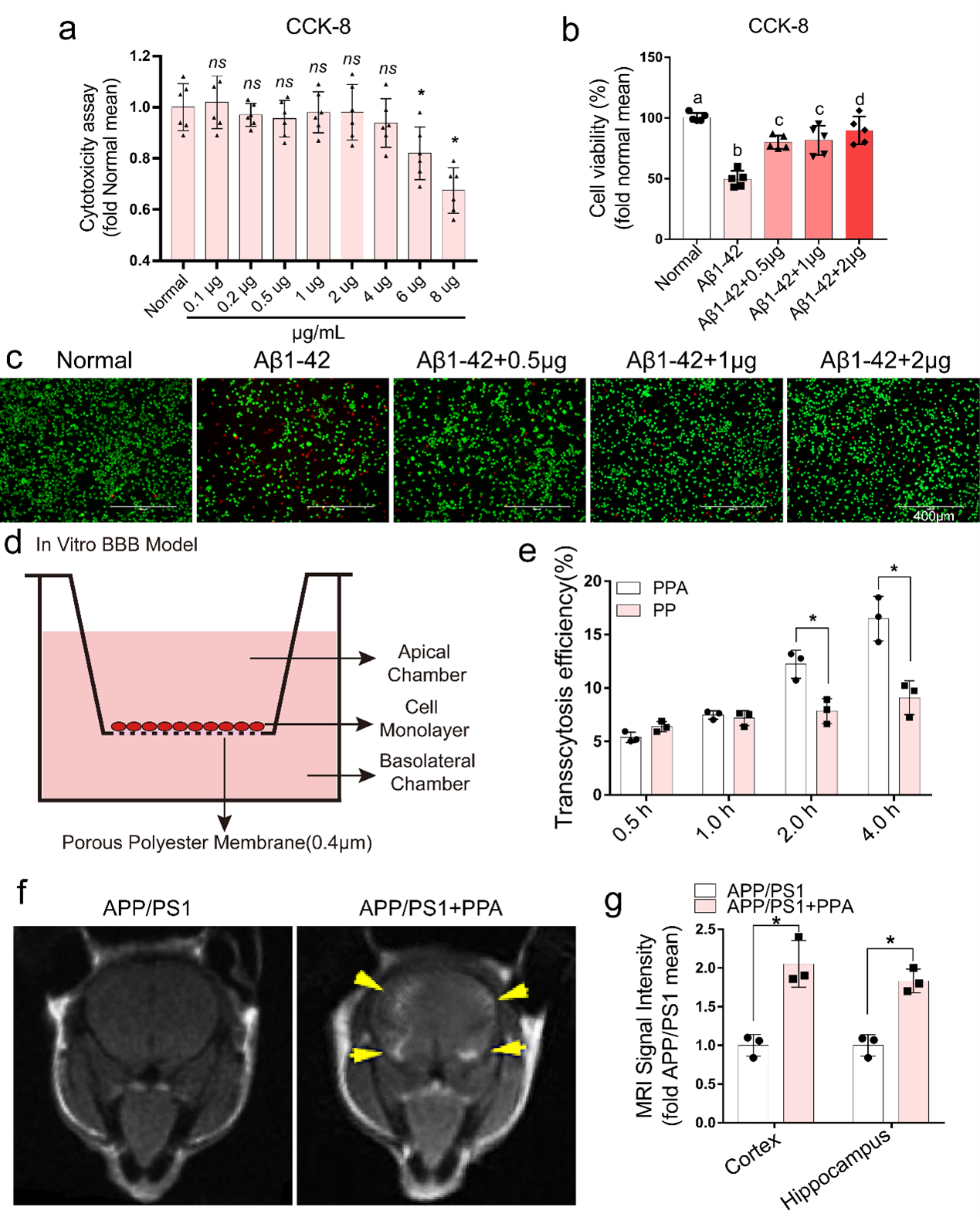 研究团队使用CCK-8检测PPA治疗后BV-2细胞的细胞活性, 0.5, 1.0, 2.0 μg/mL作为治疗浓度用于进一步实验(图3a),在该剂量下PPA纳米颗粒能够显著降低Aβ1-42(AD经典的体外造模剂)带来的细胞毒性,增加细胞活性 (图3b,c)。为了验证PPA纳米颗粒的BBB穿透性,体外BBB模型被构建,结果显示ANG-2的引入能够显著提升PPA纳米颗粒的BBB穿透性(图3d,e)。PPA纳米颗粒从小鼠尾静脉注射后的体内MRI成像也证明了PPA对BBB的穿透性(图3f,g)。
