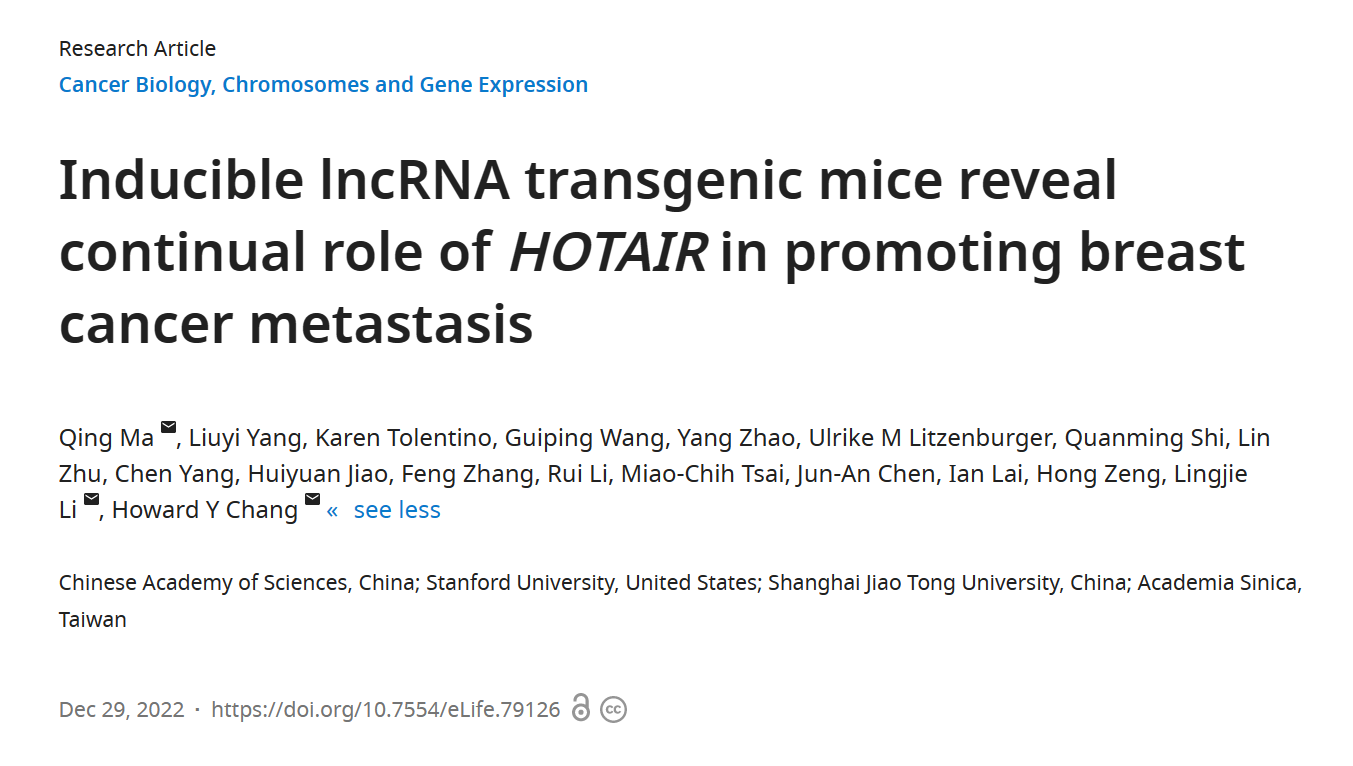 eLife | lncRNA HOTAIR小鼠模型解析其促进乳腺癌细胞转移的机制