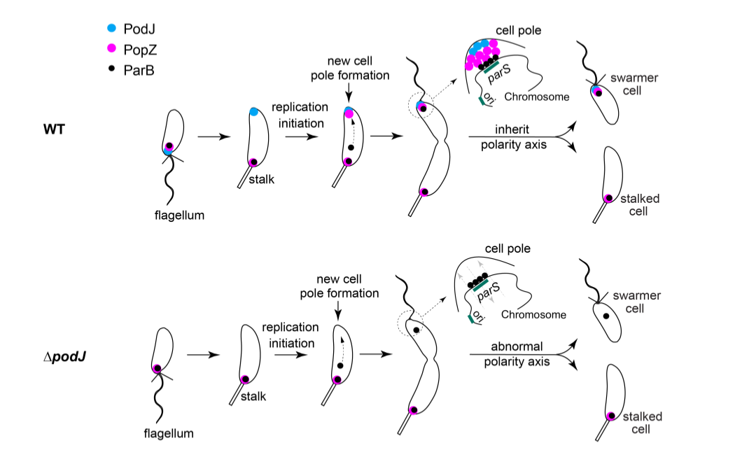 研究团队顺利获得将PodJ与其他PopZ调控蛋白(如ZitP和TipN)进行比较,突出了PodJ对于PopZ双极定位的主要调控作用。后续体内和体外实验证明了PodJ中的CC4-6结构域是与PopZ发生了直接互作的关键区域。PodJ确保了细胞新极PopZ的及时积累和细胞极性的严谨遗传。PodJ-PopZ相互作用的破坏会导致PopZ介导的染色体分离出现异常,进而可能引发细胞周期中染色体分离与细胞分裂的解偶联(图2)。