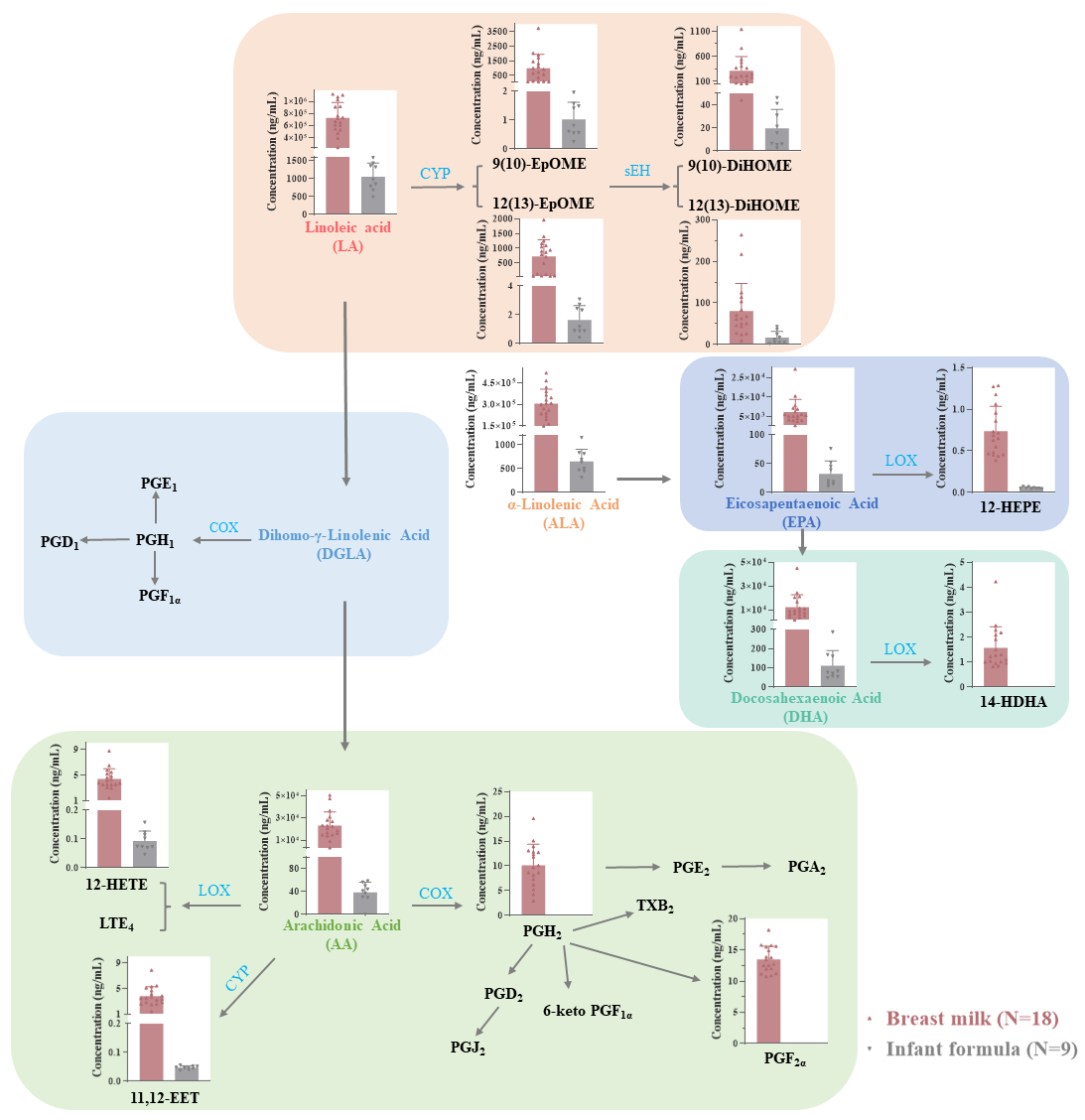 母乳中氧化脂质及前体(多不饱和脂肪酸,PUFAs)是重要的炎症介质,其组成和含量与婴儿炎症状态密切相关。氧化脂质含量低且同分异构体多,高效提取、分离和准确鉴定是现在分析的难点。研究团队开展了一种SPE-UPLC-MS/MS新方法,实现了多种氧化脂质和PUFAs的高灵敏度分离分析,并用于母乳和一段婴儿配方奶粉组分评估。研究结果发现母乳中20种氧化脂质和5种PUFAs的含量远远高于配方奶粉,强调了母乳在给予婴儿所需关键脂质介质方面的独特优势,为婴儿配方奶粉的改进和母乳化给予重要的技术和数据支撑。
