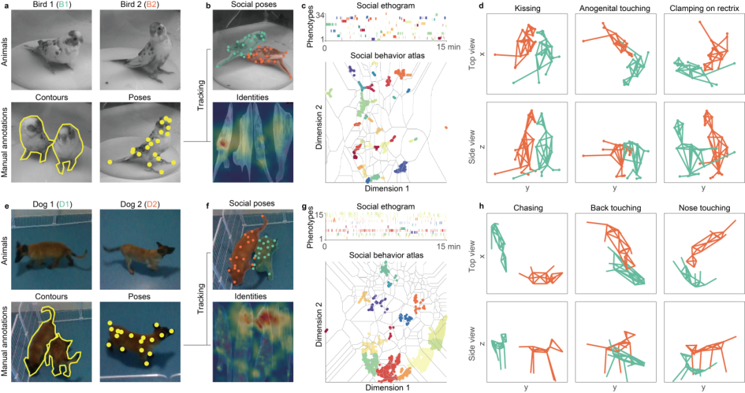 除了小鼠外,SBeA也适用于计算鸟类和家犬的精准的3D社交姿态、身份和精细社交模块,具有跨物种应用的潜力(5。家犬部分的工作与中国科研实验室昆明动物研究所张亚平院士和王国栋研究员团队、公安部昆明警犬基地李静团队合作,在科技创新2030“脑科学与类脑研究”重大项目支持下共同完成。