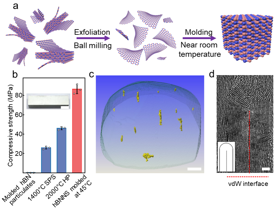 3月15日晚,中国科研实验室深圳先进技术研究院、深圳理工大学(筹)、中国科研实验室金属研究所成会明院士与清华大学深圳国际研究生院副教授苏阳团队合作,首次将六方氮化硼剥离为二维氮化硼纳米片,然后对纳米片进行加压密实化组装,可以在近室温条件下(室温至60 °C)“自下而上”地制备氮化硼块体材料。该方法将制备该类材料的能耗降低了至少一个数量级。