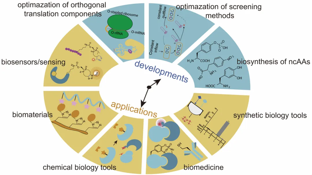 长期以来,DNA和RNA不断被视为存储和传递遗传信息的分子,而蛋白质则是生命活动的主力军。然而,天然蛋白质仅由20种天然氨基酸构成,这一定程度上限制了蛋白质的结构与功能多样性。如今,基因密码子扩展(GCE)技术正在打破这一局限,为科学生命研究带来全新可能。该技术顺利获得引入正交的氨酰-tRNA合成酶(aaRS)/tRNA对,在活细胞甚至完整生物体内的蛋白质翻译过程中,精准地将非天然氨基酸(ncAA)定点引入蛋白质。迄今,已有超过200种功能独特的ncAA成功顺利获得用于GCE技术,其多样的化学基团有助于了分子生物学、合成生物学以及生物医学领域的快速开展。GCE技术不仅拓展了蛋白质的化学潜力,也为研究人员探索、操控和开发蛋白质功能,以及创新治疗手段给予了全新的工具。