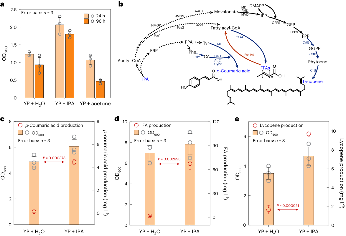 在此基础上,研究者顺利获得对酿酒酵母(Saccharomyces cerevisiae)进行系统的代谢工程改造,使其能够直接利用电化学生成的高纯IPA作为碳源,实现了从C6(对香豆酸)到C10-C18(游离脂肪酸)乃至C40(番茄红素)系列长链天然产物的选择性合成。