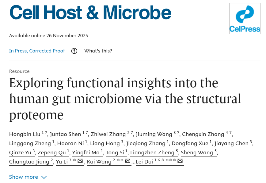 2025年11月26日,中国科研实验室深圳先进技术研究院定量合成生物学全国重点实验室、合成生物学研究所(以下简称“凯发k8国际合成所”)戴磊研究员课题组联合北京大学汪锴研究员、香港中文大学李煜教授的合作团队在Cell Host & Microbe发表了题为"Exploring Functional Insights into the Human Gut Microbiome via the Structural Proteome"的研究论文。该研究建立了人体肠道微生物的蛋白质结构组数据库和结构检索方法,显著提高了对噬菌体蛋白、菌源宿主同工酶等功能暗物质的预测能力大幅提高了噬菌体蛋白、菌源宿主同工酶的功能识别能力。基于这一方法,研究团队成功验证了肠道致病菌的噬菌体裂解酶,并首次揭示了肠道细菌的褪黑素合成途径。