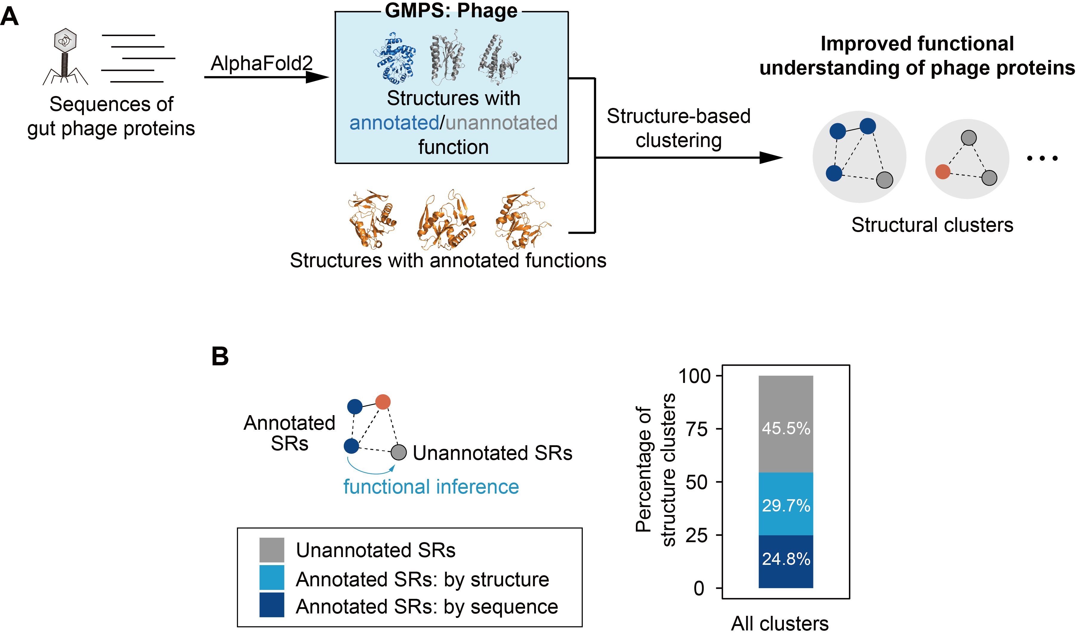 由于噬菌体基因组的快速进化,大部分噬菌体编码的蛋白难以顺利获得序列比对进行注释。研究团队采用结构比对和聚类方法,研究噬菌体蛋白的功能注释和进化规律,发现许多噬菌体蛋白与已知功能蛋白之间存在结构相似度,可以大幅提高噬菌体蛋白的功能推断能力(图2)。