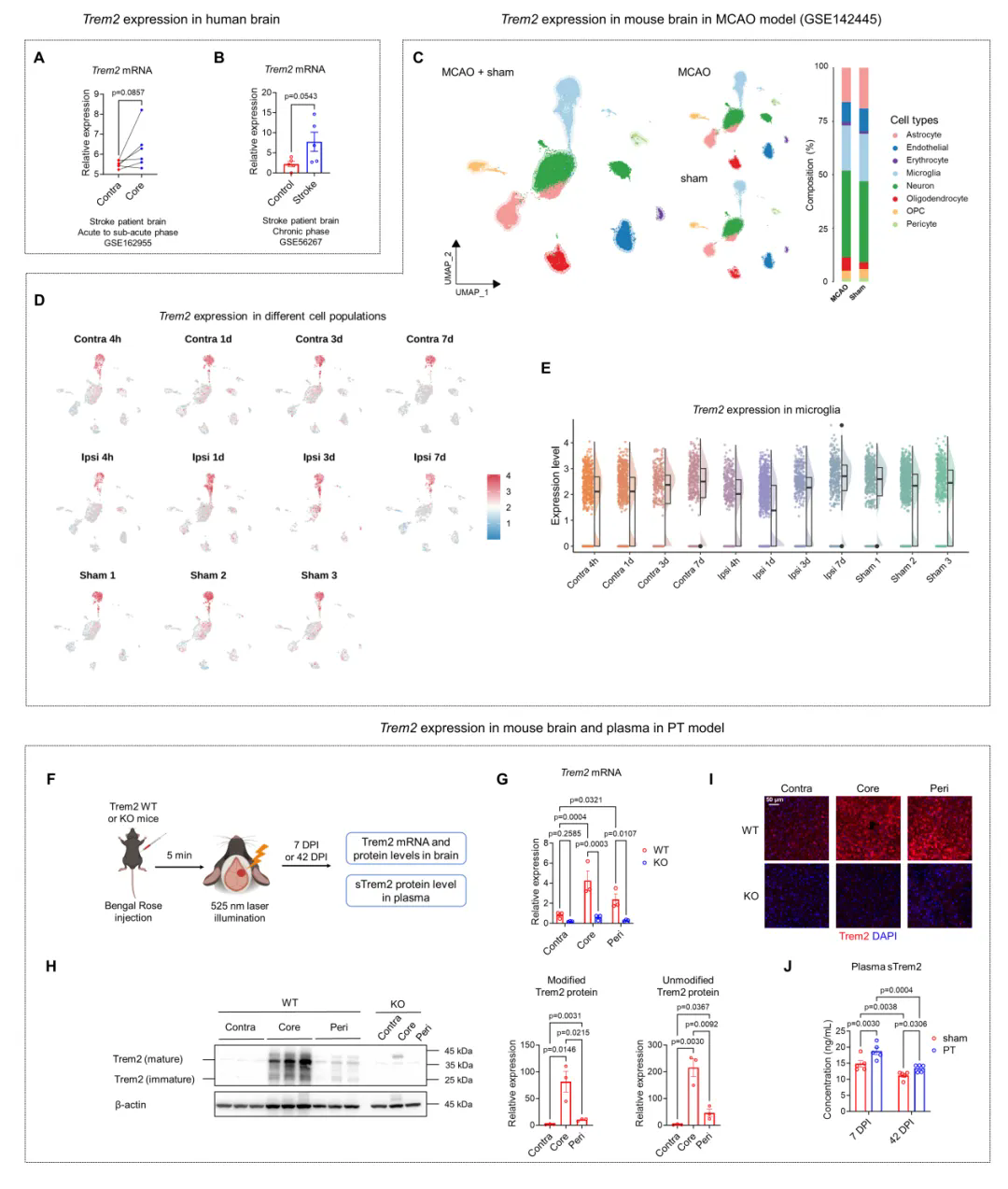 为解释Trem2在卒中动物模型与临床数据之间的矛盾功能,研究团队第一时间对文献普遍使用的脑中动脉栓塞(MCAO)卒中模型进行了系统评估,发现该模型无法有效模拟人类卒中患者大脑及外周血中Trem2表达显著上调的病理特征。基于MCAO模型取得的实验数据难以支持Trem2具有神经保护作用的结论。鉴于卒中后小胶质细胞介导的神经炎症反应是重要的病理标志,研究团队转而采用能够强烈诱导神经炎症的光化学栓塞(PT)模型。在该模型中,Trem2表达显著上调,与卒中患者的特征高度一致。
