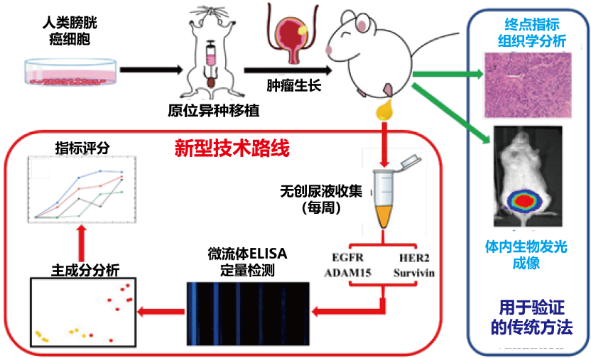 除常规尿检之外,近年逐渐开展的高灵敏生物分子传感技术,将尿液中的可解读信息推向一个新的高度。由于尿液直接来自于肾脏的代谢,并在膀胱中储存,其中天然就含有能反馈肾脏及膀胱疾病的核酸、蛋白类生物标志物。在我们的前期研究中,曾开发出一种顺利获得检测小鼠尿液中多种膀胱癌相关蛋白标志物,实现对膀胱癌原位生长进行实时、无创监测的技术。它不仅可以有效检测膀胱癌的病理进程,还能对肿瘤靶向药物的治疗效果做便捷的观测,有望在未来成为一种普惠大众的肿瘤治疗辅助观测手段[1]。